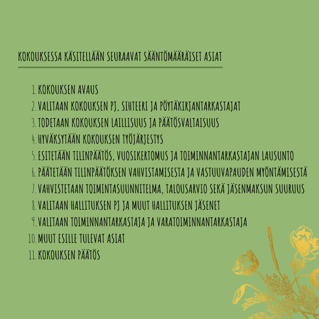 Vuosikokouksen esityslista: